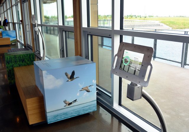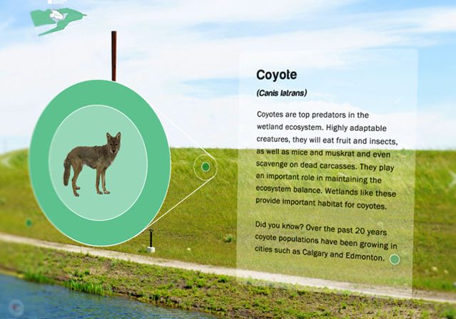 An augmented reality interactive exhibit that allows visitors to view the constructed wetlands outside of the Ralph Klein Park Environmental Education and Ethics Centre and interact with points that reveal 3D animations of the constructed wetland features and wildlife habitats. This immersive learning experience was developed for iPads utilizing their advanced sensor components.