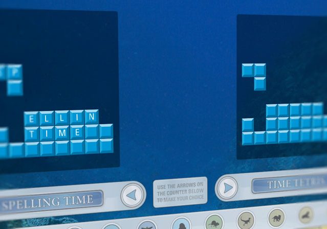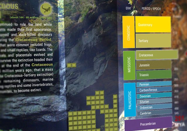 This tetris style interactive game exhibit was developed to educate visitors of the Royal Tyrrell Museum to the concept of geologic time and familiarize them with the different time periods through a highly engaging game experience. It features a game engine with two modes (a standard tetris style and a word spelling style) and a scoring system that correlates to the geological time scale.
