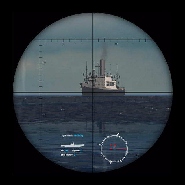 The Virtual Reality Submarine Experience was produced for the Naval Museum of Alberta and is a suitable application of VR for the museum space. The fully immersive, realistic environment allows visitors to experience what it was like to serve on a WWII submarine as they peer through the periscope into an interactive 3D world, physically rotate the periscope, and engage in an attack on a convoy of ships. Users see historically accurate ships out at sea and get a real sense of what it’s like in a submarine as they manoeuvre, target ships with their periscope cross-hairs, and fire torpedoes to sink ships while evading attacks from destroyers.